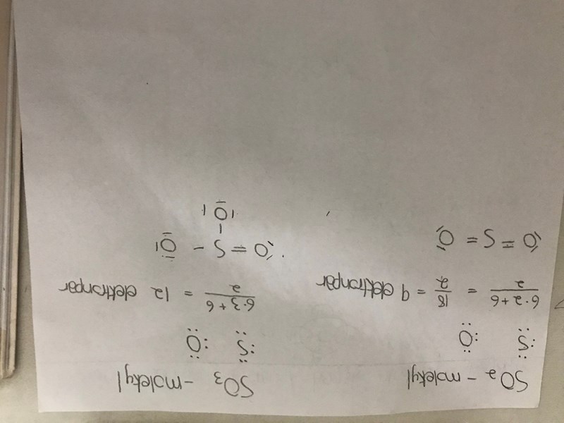 Jag förstår hur du har tänkt, men jag förstår inte varför det ska vara 6 elektronpar istället för 12 elektronpar på svaveltrioxid. Detsamma gäller för svaveldioxid, ska det inte vara 9 elektronpar som är utritade.