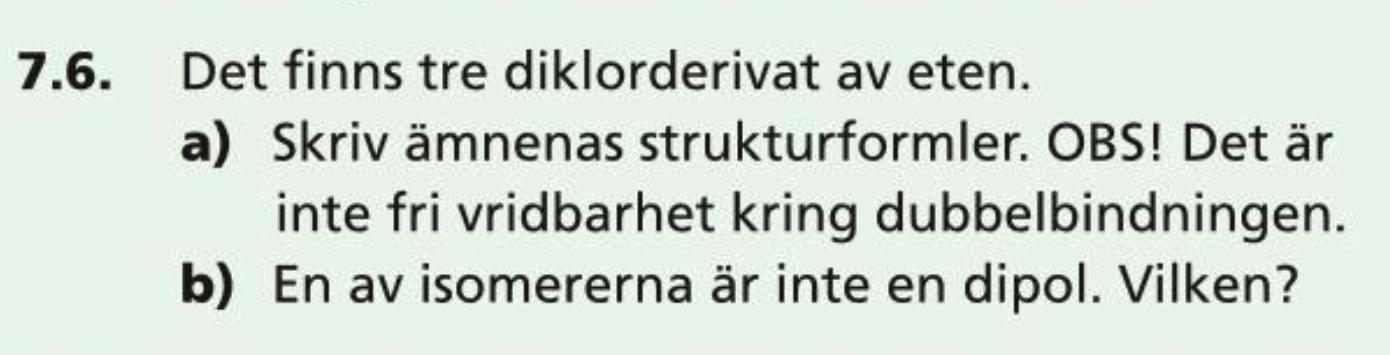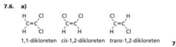 Eftersom det handlar om en molekyl med dubbelbindning är det oftast möjligt att det finns cis/trans-isomeri. I det här fallet fanns det även möjligheten att båda kloratomerna var bundna till samma kolatom.