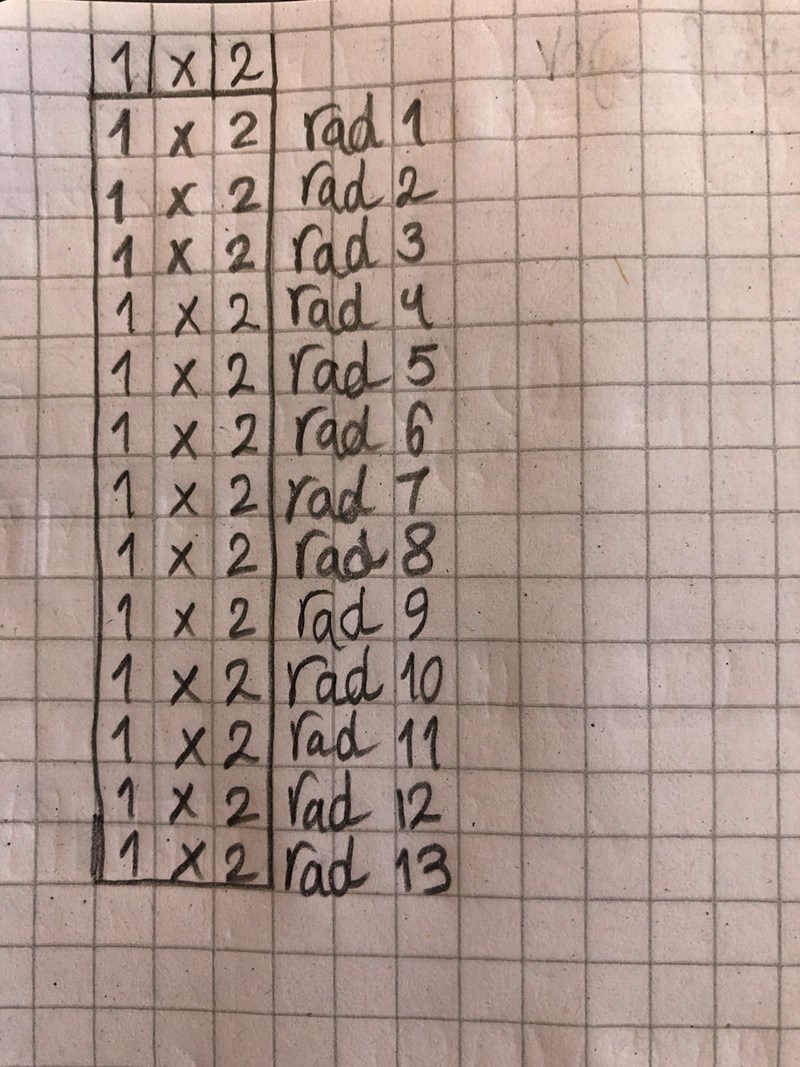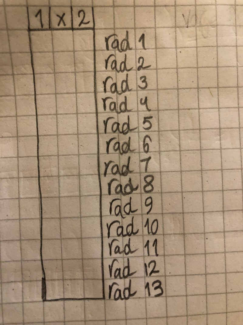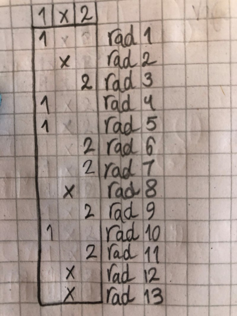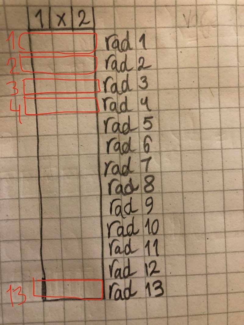 Så hela bilden som jag har ritat är en tipsrad som består av 13 horisontella rader där varje rad kan innehålla 3 svarsalternativ, 1, x eller 2. Då är jag med. Jag tror det kan underlätta att förstå problemet om jag kanske skriver/fyller i 1, x och 2 i alla 13 rader i bilden. Ska jag göra det?