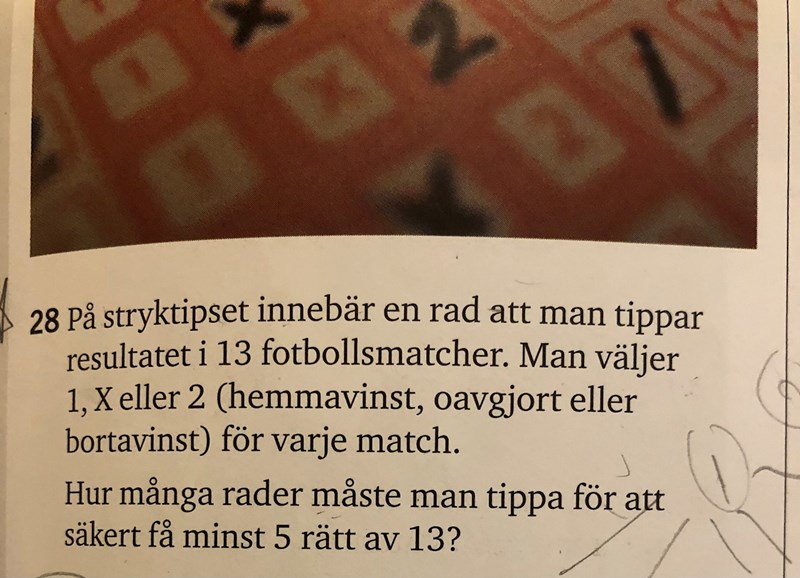 Tack, nu förstår jag det. I boken står det ”Hur många rader måste man tippa för att få minst 5 rätt”. Menar man då tipsrader eller rader som en tipsrad består av, dvs de 13 raderna som våran tipsrad består av?