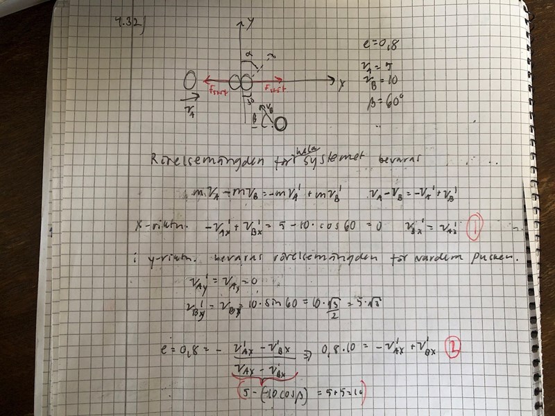 Jag förstår inte vad jag gör för fel på denna uppgiften. Jag förstår att rörelsemängden bevaras i riktningen. Men när jag ska beräkna ex riktningen så får jag motstridiga resultat. Jag har skrivit röda siffror på det är motstridiga svaren. Har jag tänkt fel ang rörelsemängdens bevarande?