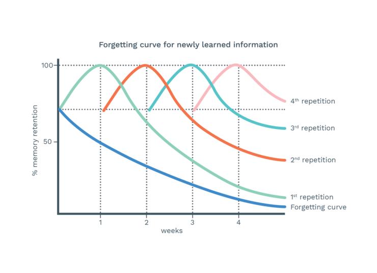 Något som jag börjat applicera inom mina studier är Spaced Repetition som går ut på att man ska komma tillbaka till något man lärt sig efter en viss period, detta eftersom att man väldigt lätt glömmer vad man lärt sig, se nedan: