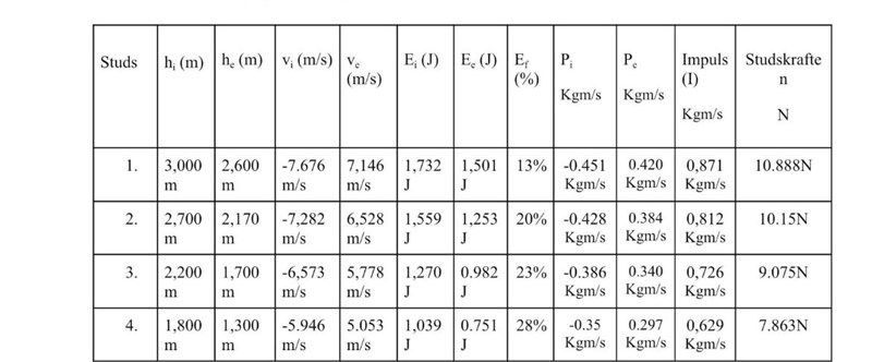 Håller med studsboll laboration jag beräknade rörelsemängden, impuls samt stöt/studs-kraften som bollen utsätts för under tiden 0,08 s. Även beräknat hastigheten, energin och den procentuella energiförlusten. Men behöver analysera värden för det är det enda som saknas i diskussionen men vet inte hur jag ska analysera om just värdena och förklarar samband då höjden varieras efter försök kan ni ge tips. Bifogar tabellen också.