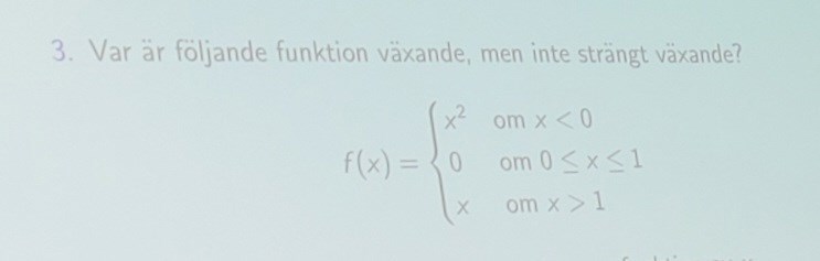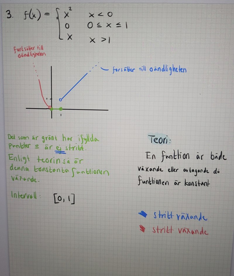 Macilaci skrev:Ja, din analys är korrekt. (OBS! Den röda delen av funktionen är inte strängt växande utan strängt avtagande, men det vet du säkert.)