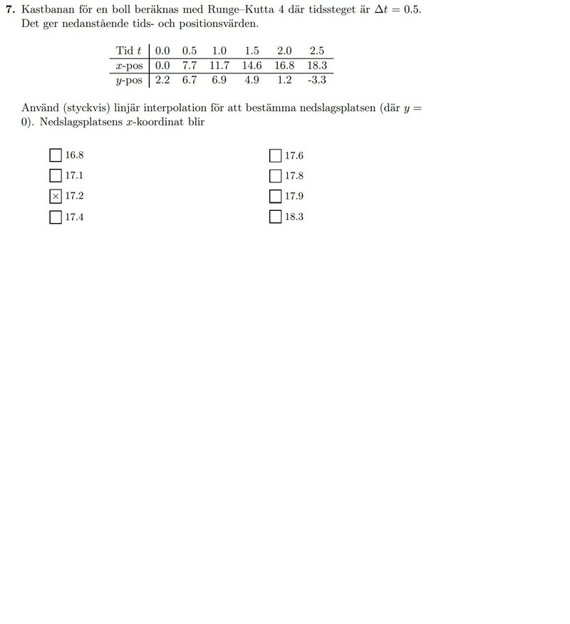 Hej!Jag har problem att förstå denna fråga. Så som jag förstått det, så har jag en del x värden och y värden och jag vill veta vad x är när y är noll. Om jag ska använda styckvis linjär interpolation, räcker det med att ha två rader av y=kx+m. Men jag får fel svar.