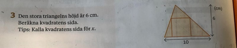 då kan man räkna ut höjden på den lilla triangeln genom att vi vet att höjden på den stora triangeln är 6 cm och att kvadratens höjd är X cm. Den lilla triangelns höjd blir då 6-X