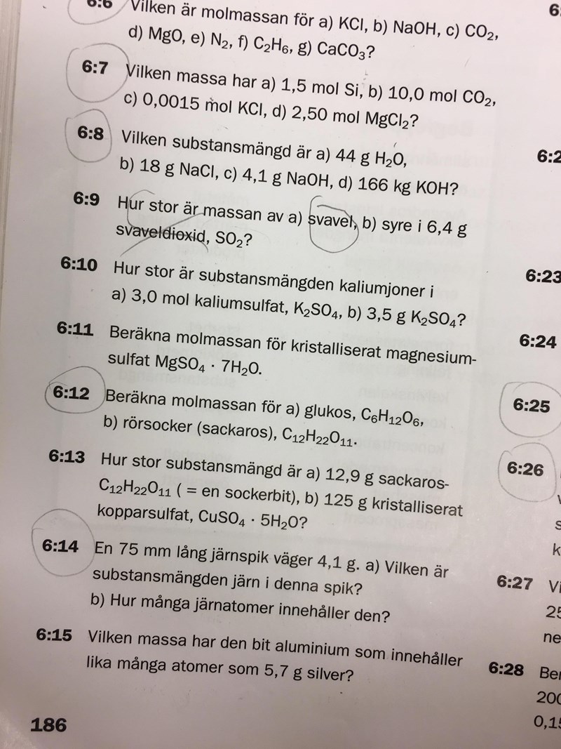 Hej jag har fastnat på fråga 6:10 där man ska räkna substansmängden, vet inte riktigt hur man ska göra