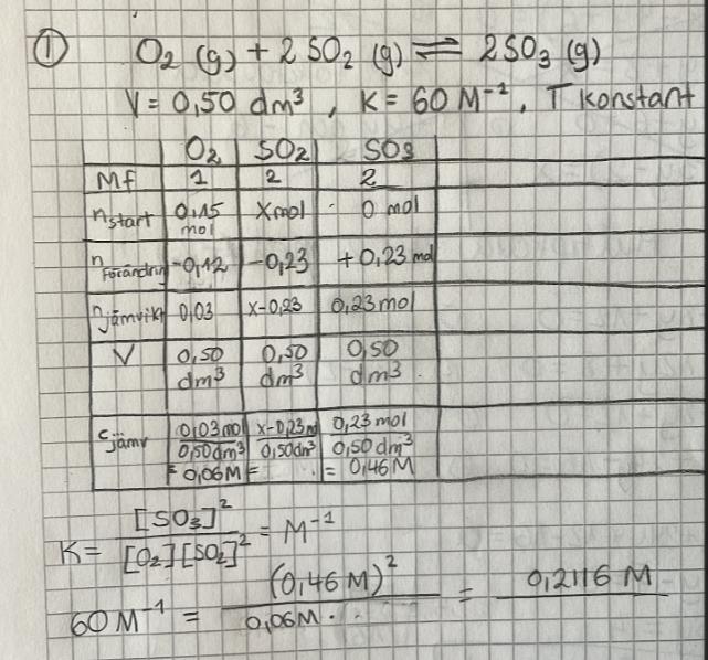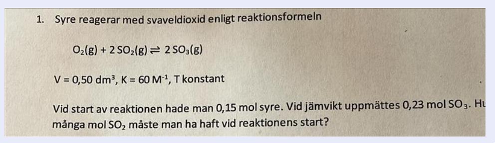uppgiften låter så:Här nedan har jag satt in alla värden i en tabell och markerad substansmängd vid start som x. Men hur gör jag nu? Undrar om jag krånglar till det nu bara....koncentrationen av SO2 vid jämvikt skulle ju då bli (x mol-0,23 mol)/0,50 dm3