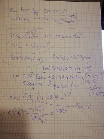 Det jag reagerar på är alltså att man ju går från ett led där man säger sig jobba med n och V, till att i nästa led jobba med m och tja, M*V , väl? Och ja, det är m av bariumsulfatet, och molmassan för det multiplicerat med volymen för den ursprungliga lösningen med sulfatjoner (vars koncentration i lösningen som skulle bestämmas), och de är ekvivalenta, men...
