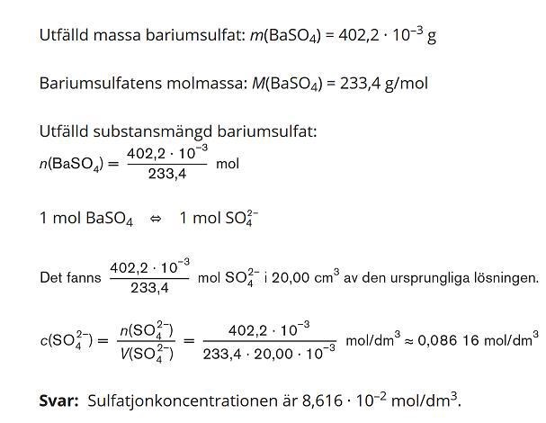 Nedan följer mina beräkningar, och exemplet i min kursbok. Det jag fastnar på är när kursboken kommer till själva koncentrationsberäkningen. Jag tycker de byter vad de gör mitt i allt. De går från att C=n/V till att i nästa steg inte ställa upp siffrorna för detta, utan massan i täljaren, och molmassan i nämnaren. Jag fattar att sulfatjonerna och bariumsulfatet är ekvivalenta. Tacksam för förklaring av hur man menar när man ställer upp att c (SO2-4) = n (SO4) / V (SO4) = 402,2*10-3 /233,4*20*10-3 .