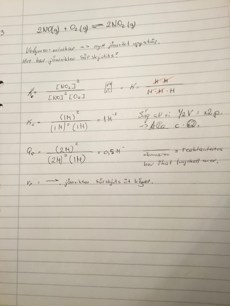 De skriver i facit: Om kärlets volym minskas, så ökar trycket. Vid tryckökningen gynnas den reaktion som medför att substansmängden gas minskar. Jämviktsläget har förskjutits åt höger.