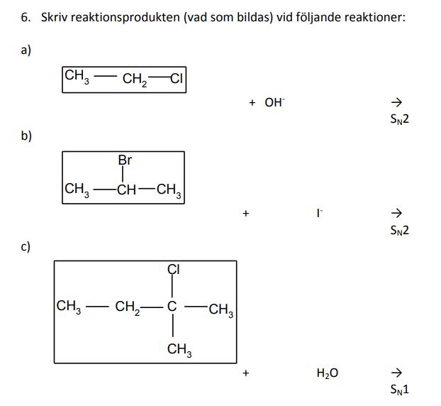 i till exemel a) och c) bildas det ju en alkohol. det betyder att ämnena i a) kan vara t. ex 1-klorpropan och OH-, men jag har nog inte riktigt fattat varför klor byts ut mot hyroxidjonen. alltså, varför är det inte ex bara vätet i hydroxidjonen som byts ut med klor istället för hela jonen? har det något att göra med nukleofiler och elektrofiler, typ att OH- är nukleofilen och att kolet som klor binder till är elektrofilt?