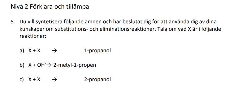 tycker det här är lite svårt och att den här uppgiften var lite klurig så om någon har tips på hur man kan tänka får ni gärna dela med er. jag tänkte iaf att eliminationsreaktioner skapar alkener, då behöver jag typ bara förstå vad som elimineras för att kunna fatta vad för ämne som kan vara X.