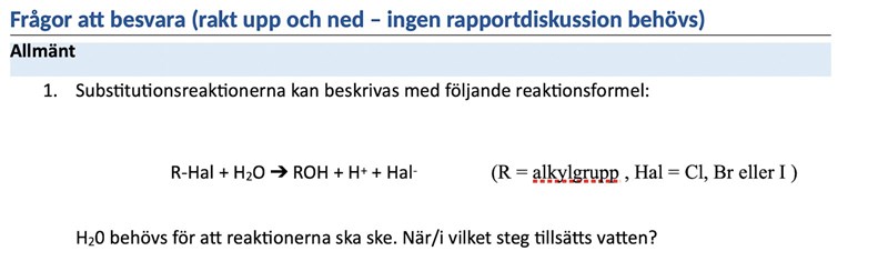 Hej! Jag ska besvara frågor angående substitutionsreaktioner. Labben var online, och därmed finns endast ett videoklipp postat där en lärare utför laborationen.