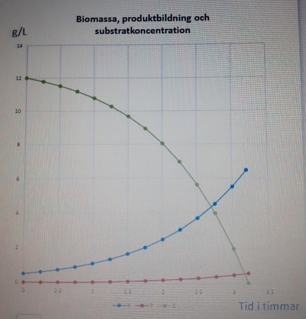 b) För bildandet av biomassa, så avstannar bildningen inte förrän all glukos är konsumerad, vilket ser ut att vara vid ~3,3 timmar, och vid denna tidpunkt kan du direkt läsa av massan för biomassan på y-axeln. Nästa fråga blir väl då om biomassan är torr eller blöt?