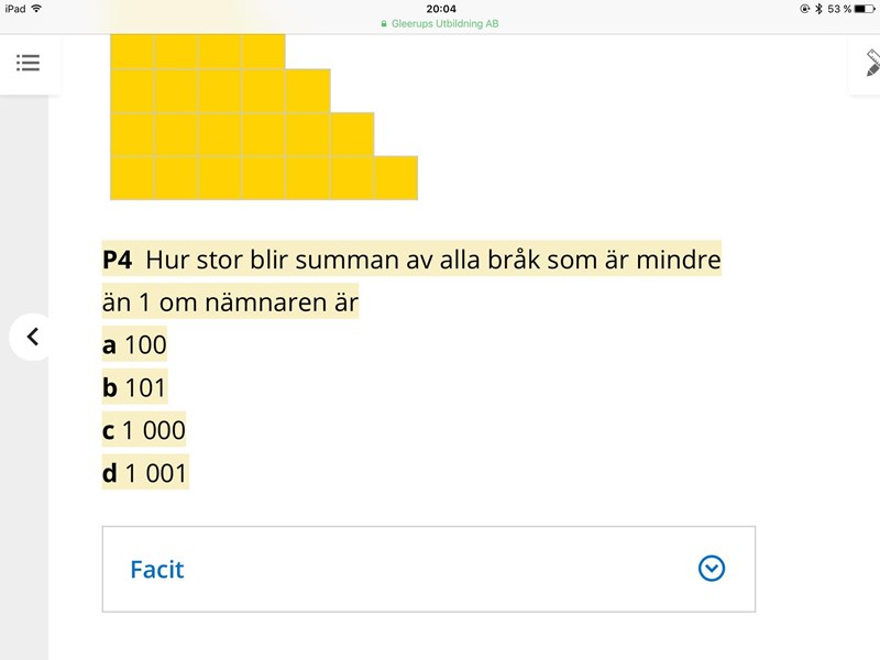 Alla bråk som är mindre än ett om nämnaren är 100, har en täljare som är mindre än 100 (troligtvis menar de positiva heltal). Alltså 1100+2100+3100+...+99100. Vad blir summan av dessa tal?