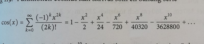 I denna uppgiften ska jag beräkna värden till och med x^10, det tal jag får då ska genera ett approximativt värde som på miniräknaren ska ge cos(1)