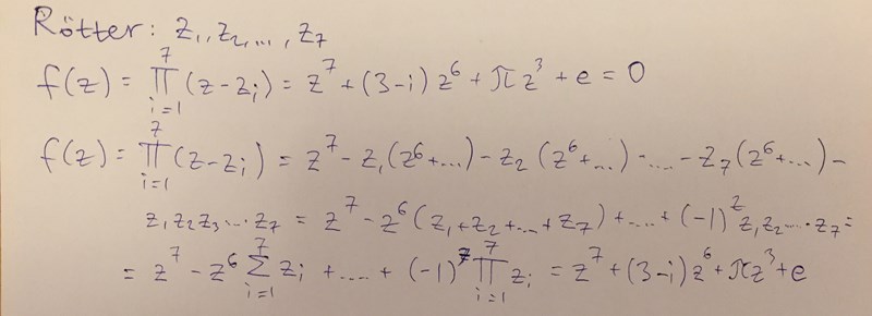 Det är inte jätteenkelt att multiplicera ihop parenteserna, men det går. Det blir 196 termer att addera ihop. En enda av de termerna innehåller z^7, och en enda av de termerna innehåller z^0 (dvs enbart konstanterna rot1, rot2, ...) i någon kombination.