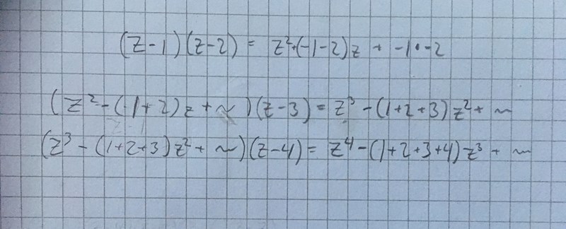 Alla ekvationer kan skrivas som (z-rot1)(z-rot2)... Börja med egna andragradare eller tredjegradare osv och se vad som händer. Välj enkla tal och räkna ut innan vad du letar efter.