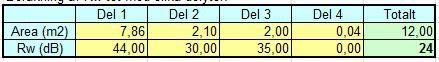 Exempelvis så kan jag med excel räkna ut att en 12m2 vägg med reduktionstal R´w=44 dB med en dörr 2,1m2 reduktionstal R´w=30dB och ett fönster 2m2 R´w=35dB samt ett hål 0,04m2 reduktionstal=0dB får en resulterande reduktion på 24dB.