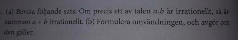 a + b = c a = c - b. Men skillnaden mellan två rationella tal är alltid ett rationellt tal, vilket skulle betyda att a är rationellt. Detta motsäger förutsättningen (dvs att a är irrationellt), så vårt antagande (att summan är rationell) måste vara fel och summan av a och b måste därför vara irrationell.