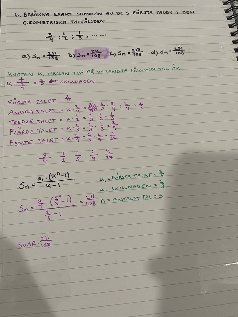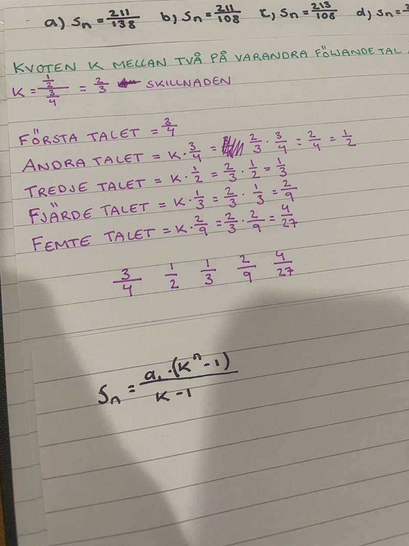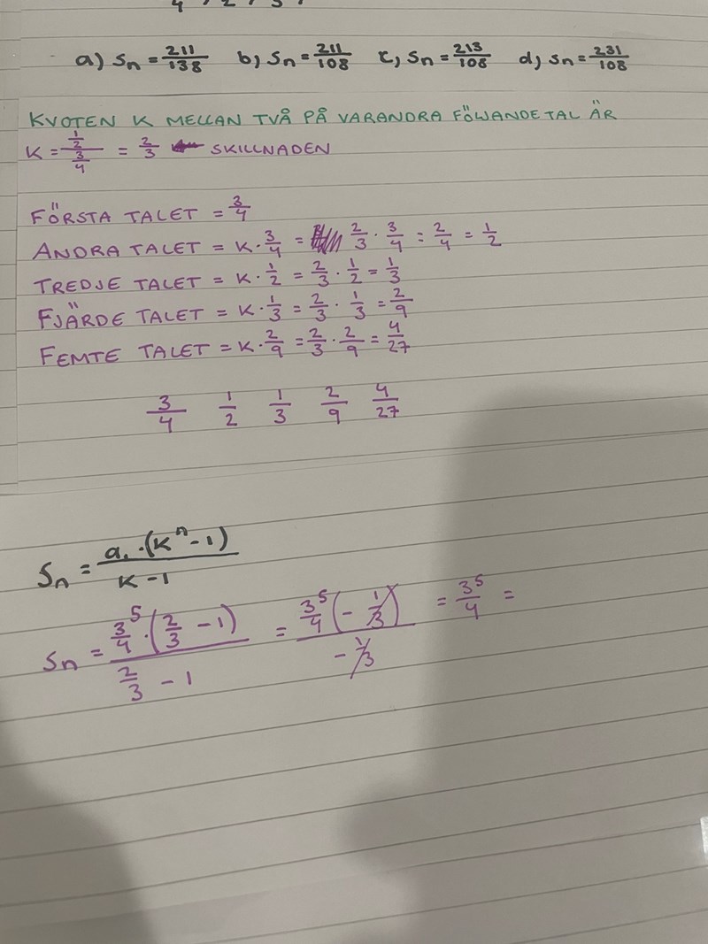 Denna? K är ju 2/3, a1 antar jag är det första talet alltså 3/4, men vad är n?