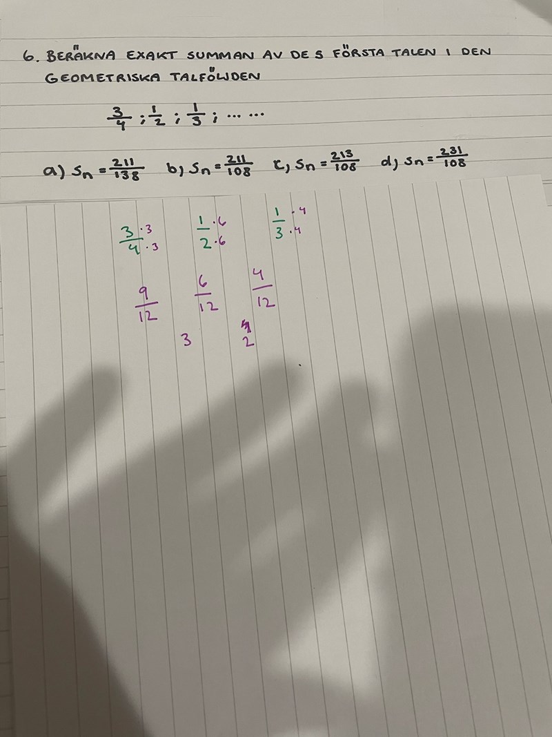 Hur ska man tänka på denna fråga? Jag började med att skriva om till samma nämnare å ska jag isf sen följa de mönstret? Alltså så att tal 4 blir 1 mindre typ 3/12 och sen sista lika? Alltså 1 skillnad å sen 0 skillnad?