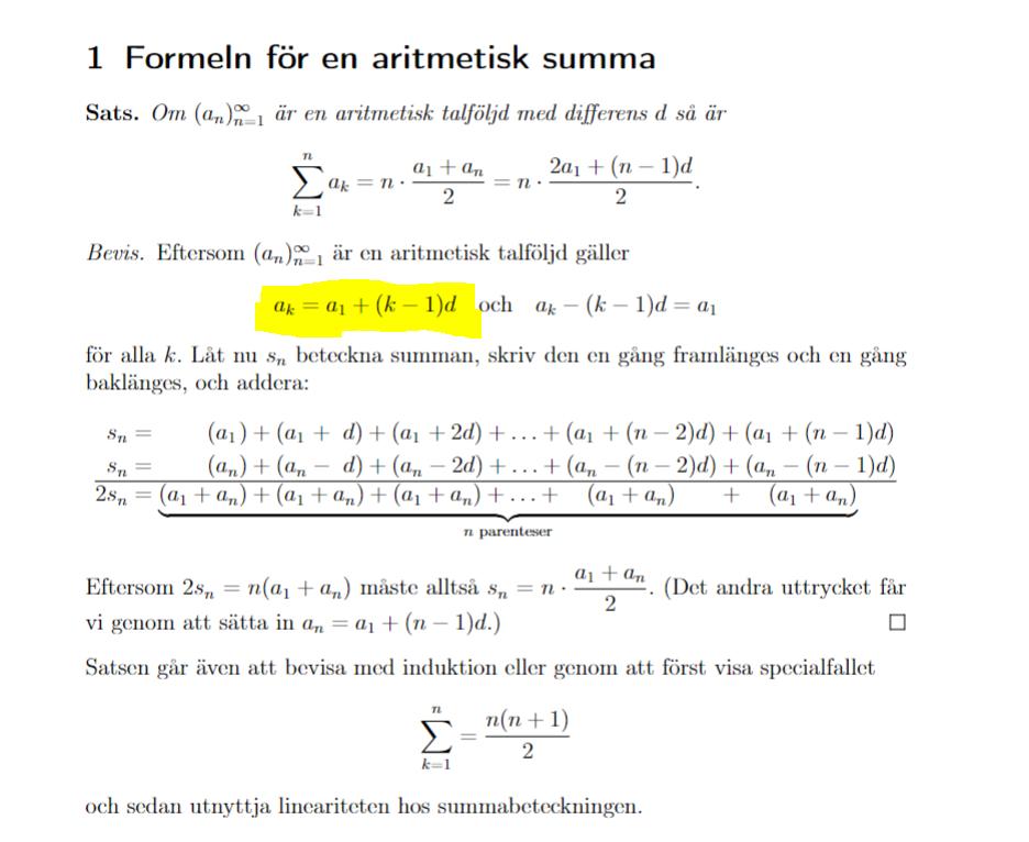 Jag förstår inte den gulmarkerat, varför kan en specifikt tal i aritmetiskt talföljden beskrivas som:
