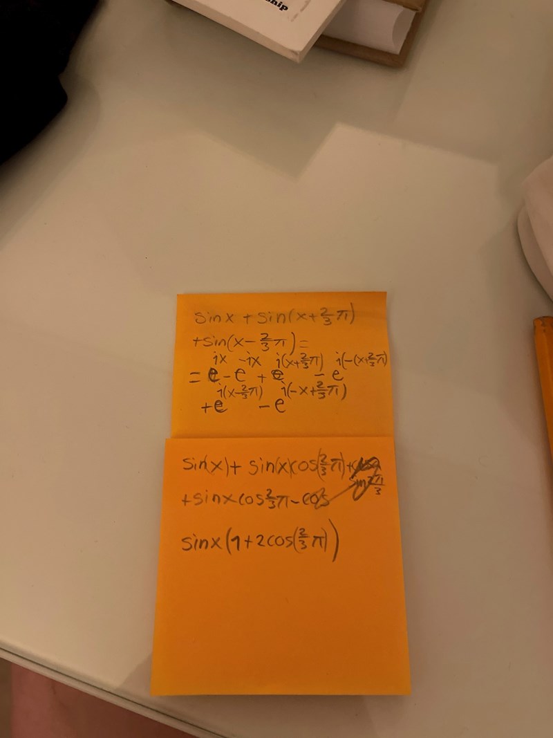 jag tänker såhär: sin(x)+sin(x+2/3pi)+sin(x+4/3pi) men jag vet inte hur det ska bli 0!! Kan någon snäll själ hjälpa mig