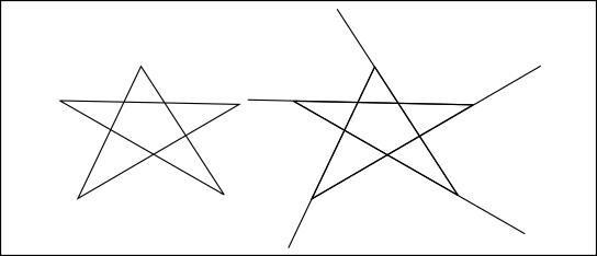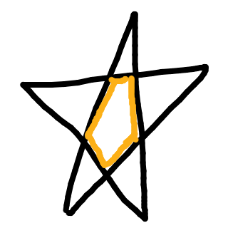 Nu till stjärnorna. För en stjärna har vi något liknande men en observant person ser nu kanske att summan av yttervinklarna inte är 360 utan istället är 720 (två varv) eftersom man går två varv runt centrum om man vandrar längsmed polygonens sidor snarare än ett varv som i fallet med en simpel polygon. Jag kan tyvärr inte troliggöra detta med en utzoomning.