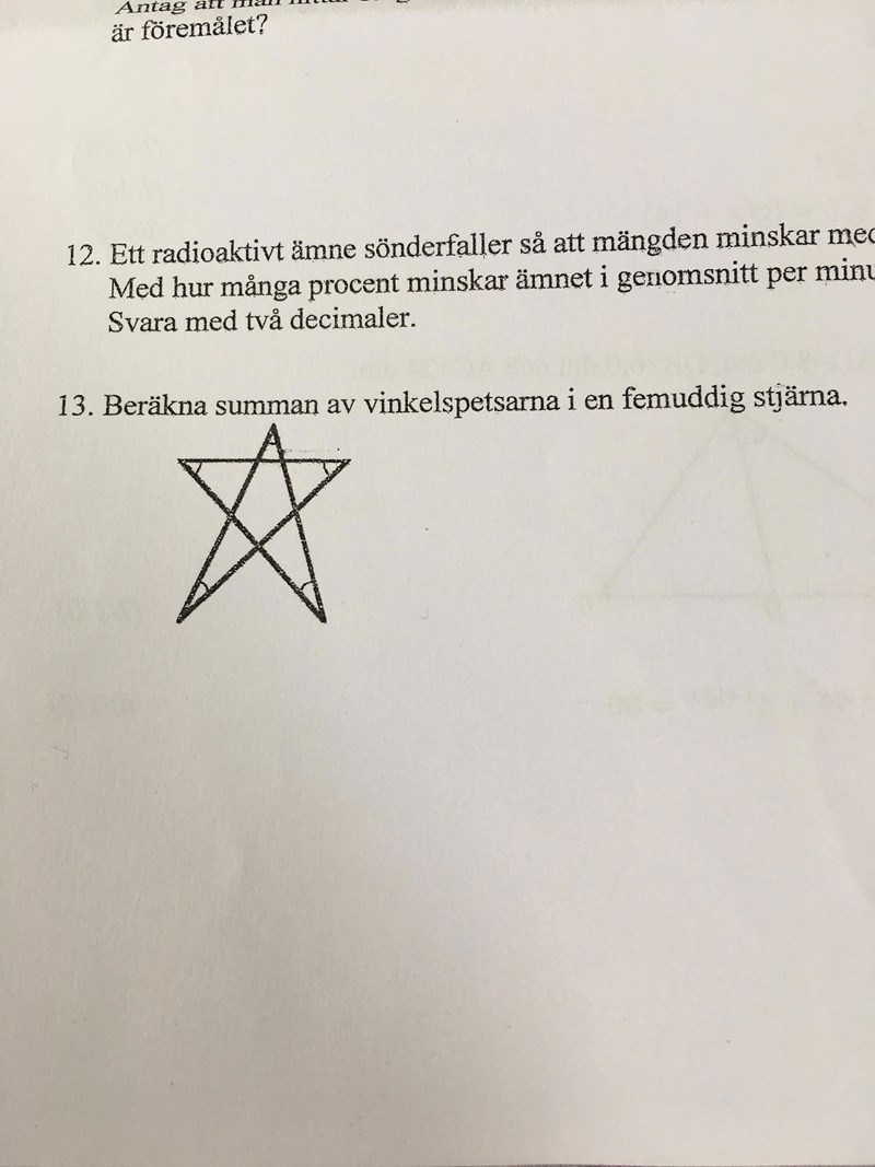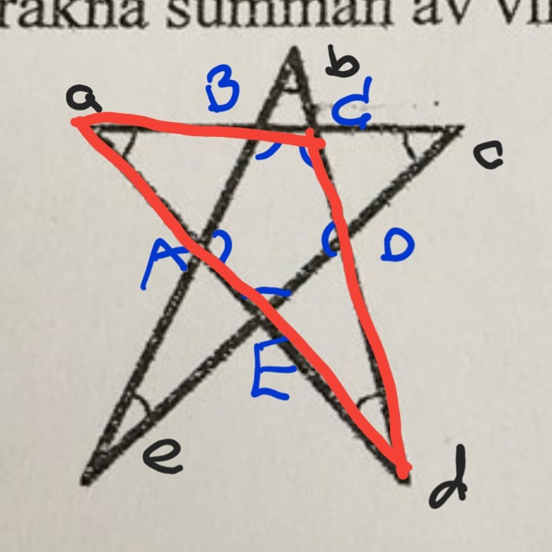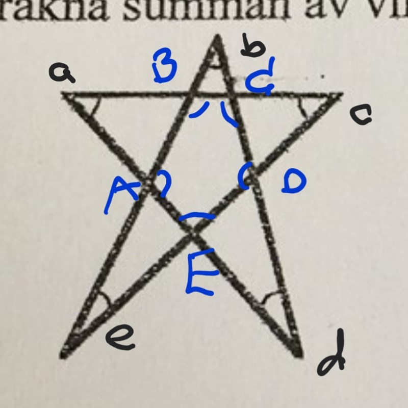 Därur kan man enkelt beräkna vinkelsumman a+b+c+d+e.