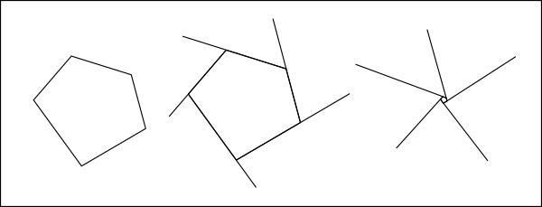 Idé 2. Man kan även anpassa yttervinkelbeviset för vinkelsumman hos en polygon till stjärnpolygoner vilket även har fördelen att det generaliserar till stjärnpolygoner oavsett hur många hörn de har. För oss som inte minns yttervinkelbeviset för polygoners vinkelsumma (för polygoner som inte skär sig själva) så utgår det från att man förlänger polygonens sidor ut i rummet längsmed en orienteringsriktning.