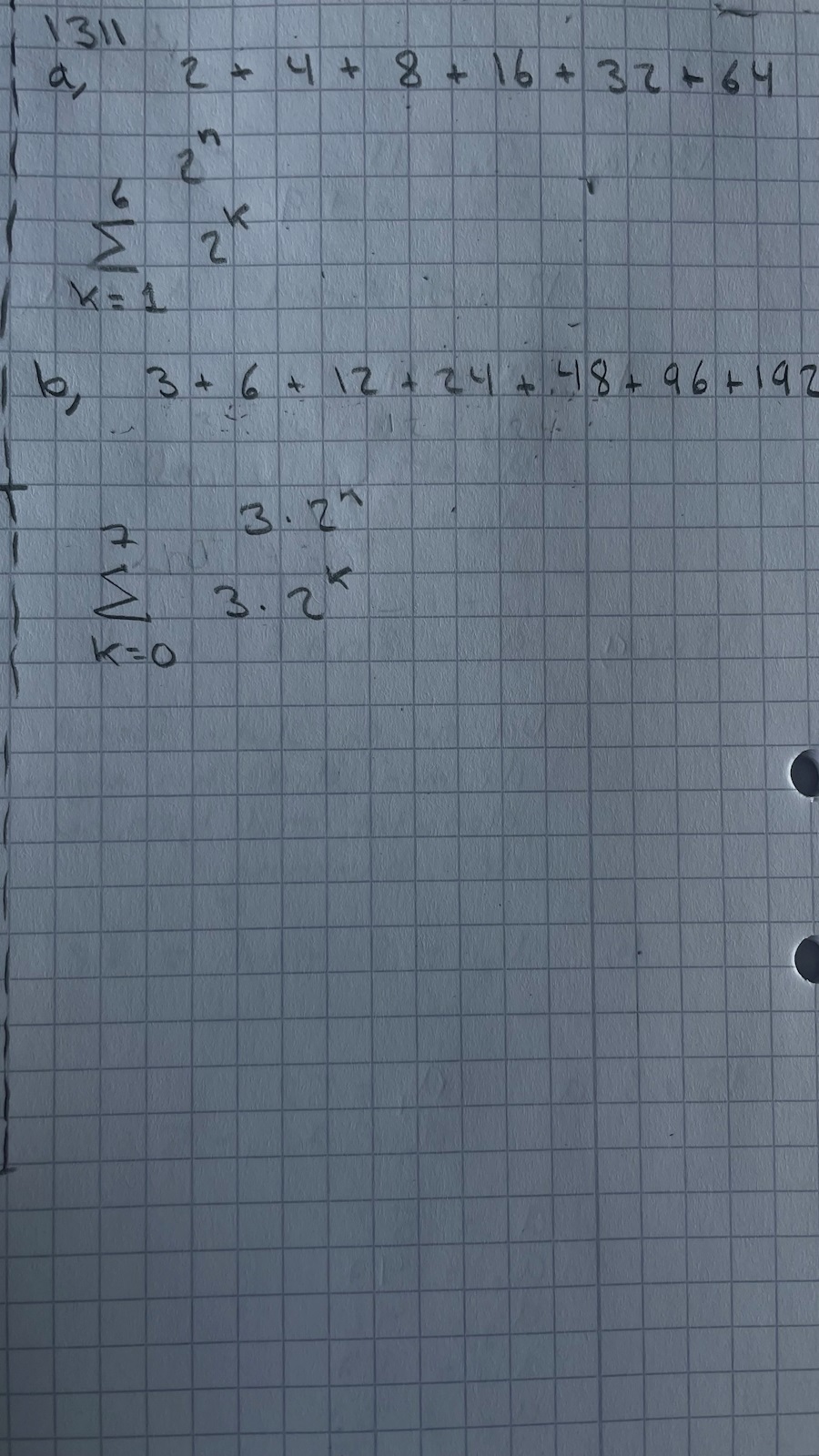 b) 3+3*2+3*22+3*23+…+3*26 = summa (3*2k) där k = 0, 1, …, 6