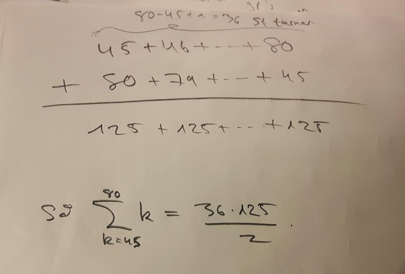 Denna metod kan även användas för att härleda formeln du använde. Genom att förstå det bakomliggande tricket är det enkelt att komma ihåg att är antalet termer i summan, som i detta fall är 80-45+1=36, och ingenting annat :)