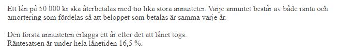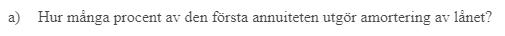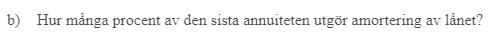Jag tänker att den allra sista annuiteten utgörs av 100% ammortering för den inte har tid att växa av räntan. Men det är fel svar. Det är möjligt at jag inte riktigt förstår begreppen, men hur ska jag ta mig vidare?