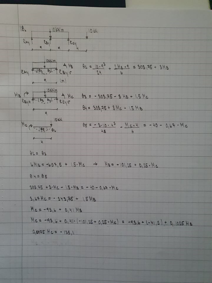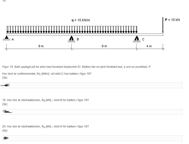 Har problem med en uppgift där jag ska beräkna ut momenten på en balk och har kommit fram till detta svaret men det är fel och undrar om ni kan hjälpa mig hitta felet. Det är uppgift 18 och min lösningar är så här.