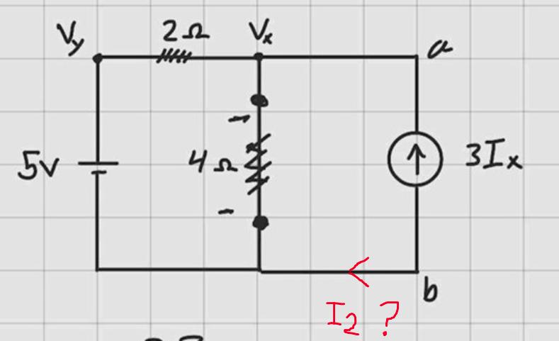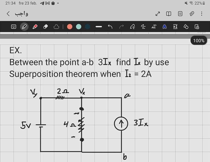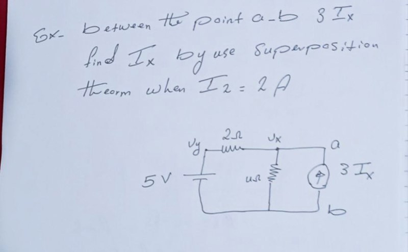 jag har börjat med att använda Superpositions satsen att göra short till batteri källa, sen ska man lösa ut Ix som finns till höger och då använder KCL. Jag får fel svar.