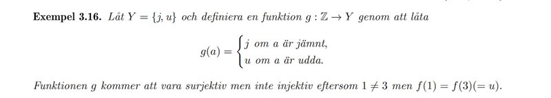 Jag har jobbat på detta exemplet i min kurslitteratur och jag är helt med på varför funktion g inte blir injektiv. Men jag fattar inte hur den är surjektiv? Jag ser det som att Målmängden={Y} och att värdemängden inte blir detsamma? Hur ska jag tänka...