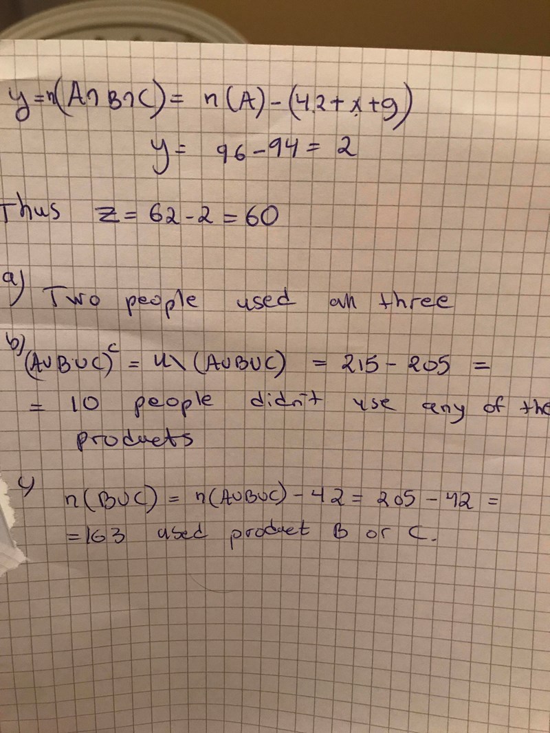 In a market research 215 persons were asked if they have used any of three competing products A, B and C.
