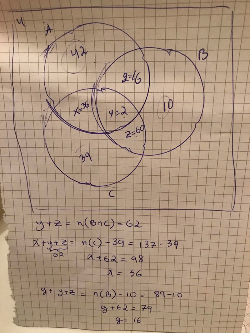 Läser ”Data Analytics”. Har bifogat två bilder. Är lösningen korrekt? Det jag var osäker på var om venn-diagrammen skulle ritas så att vi får en genomskärning av alla tre set; alltså fråga 1.