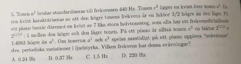 - I uppgiften står det: ”På ett piano är alltså tonen e^(2) en faktor 2^(7/12) ungefär 1.4983 högre än a^(1). Om tonerna a upphöjt i 1 och e upphöjt i två spelas samtidigt på ett piano upplevs ’sväningar’, dvs. periodiska variationer i ljudstyrka. Vilken frekvens has dessa svägningar?” Vilken ton är i detta fallet a upphöjt i ett? Om a1 generellt sätt är 440, och här är e upphöjt i två 1,4983 gånger större än a upphöjt i ett, varför kan man inte ta skillnaden mellan deras frekvens?