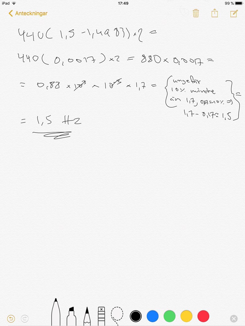 Vill du räkna ut frekvensskillnaden blir det 440*(1,5-1,4983)*2. Förenkla och gör att överslag.