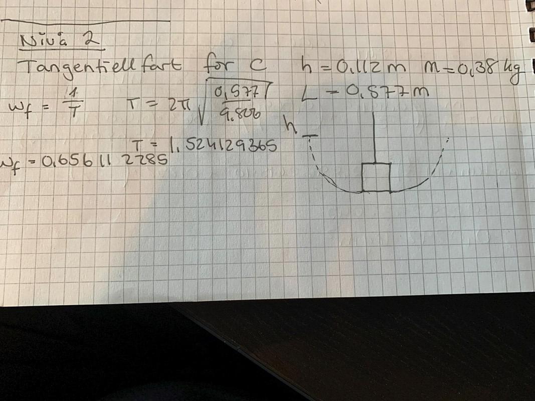 Beräkna den maximala tangentiella farten för pendel C som släpps från höjden 0,112 m om den har massa 0,38 kg, är punktformig och har snörlängden L = 0,577 m.