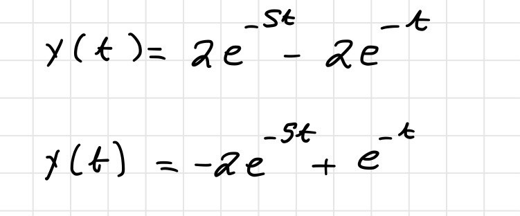 Jag tittade bara på den andra funktionen. Den börjar med ett värde y(t=0) = -2 + 1 = -1. Den första termen som är negativ blir snabbt liten i jämförelse med den andra termen, så funktionen blir positiv innan den går asymptotiskt mot noll. Så funktionen passerar jämviktsläge en gång. Med en skiss ser man snabbt att det sker lite innan t=0,2 där båda termer är lika stora.