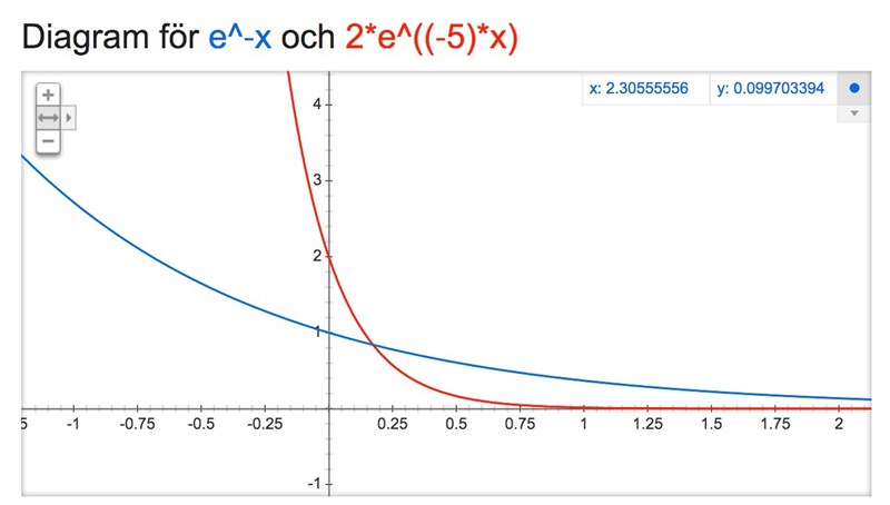 Funktionen har nollpunkt där termerna är lika stora, alltså vid t ≈ 0,17.