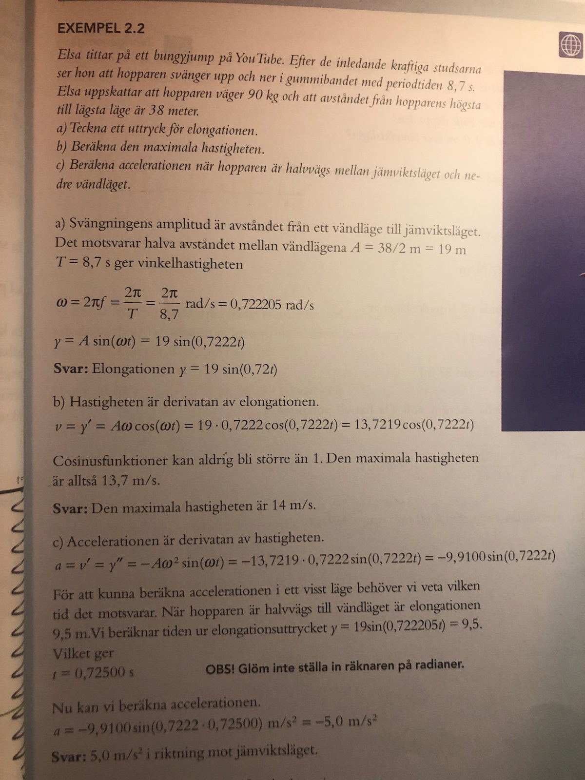 i b) så slog jag: 19 · 0,7222cos(0,7222T) på miniräknaren och fick samma svar som i genomgången. Hur kommer det sig att man kan skriva så och den räknar ut maxhastigheten? T är ju en variabel? Detta är säkert basic men jag blev väldigt nyfiken.