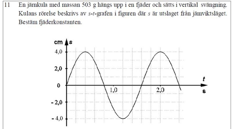 Det är en formel som brukar finnas med i många formelblad. Utifrån den så borde du kunna lista ut fjäderkonstanten i uppgiften.
