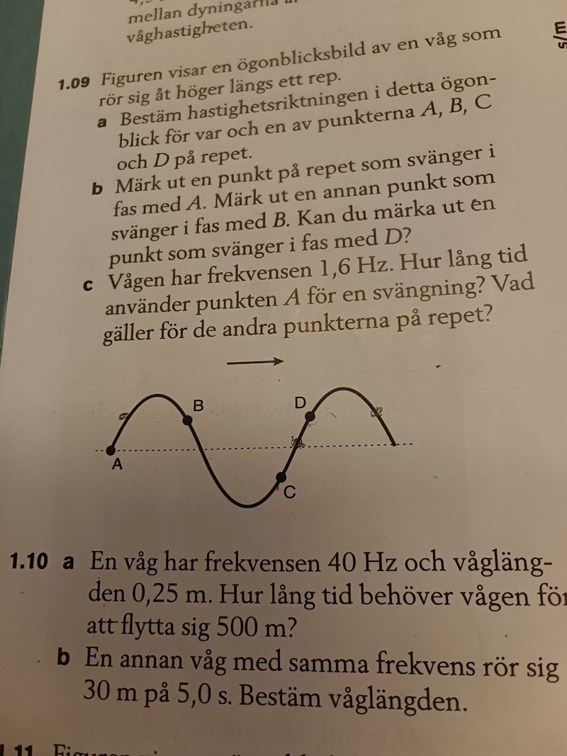 a) Bestäm hastighetesriktningen i detta ögonblick för var och en av punkterna A, B, C, D på repet.