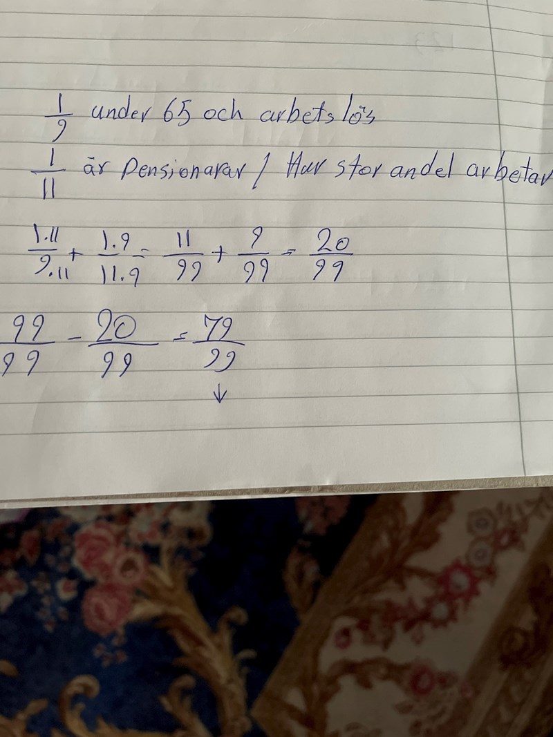 4) I en by är 1 9 av den vuxna befolkningen under 65 år arbetslös och 1 11 förtidspensionerad. Resten arbetar. Hur stor andel arbetar? Svara exakt.