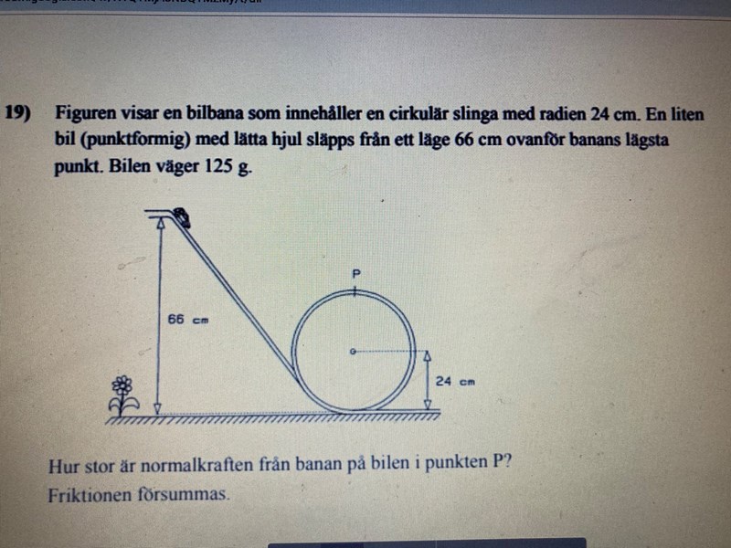 Jag har räknat ut att bilen har hastigheten 3,6m/s vid h=0 och får de att centripetalkraften är 6,75N. Förstår inte hur jag ska komma vidare härifrån?